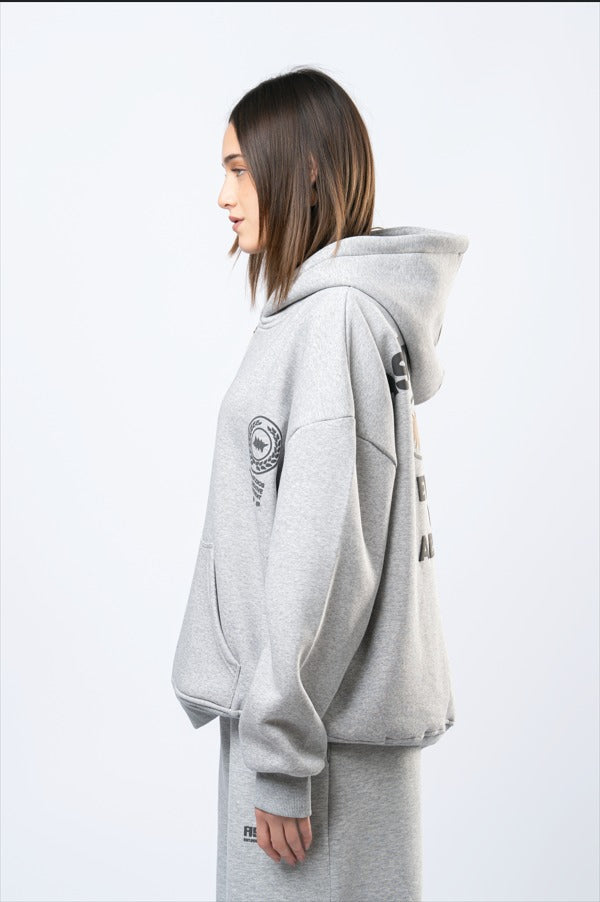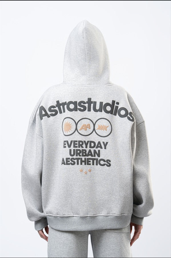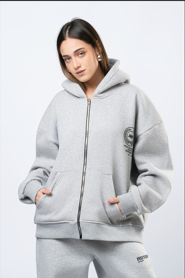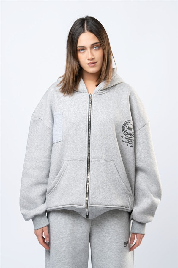 A grey zip-up jacket with a bold back graphic. Minimal in design, elevated with a chest pocket and practical details for everyday comfort.