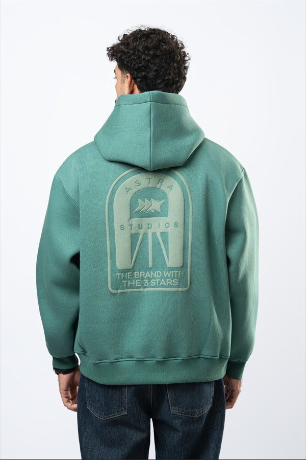 Light olive street hoodie featuring a clean embroidered chest badge and a bold puff-print back graphic with Astra Studios and The Brand With The Three Stars. Made from premium heavyweight fabric with a relaxed, structured fit that holds its shape. Designed for everyday
